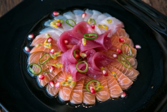 Rebanadas de pulpo, salmón, alcaparras, arúgula y champiñones